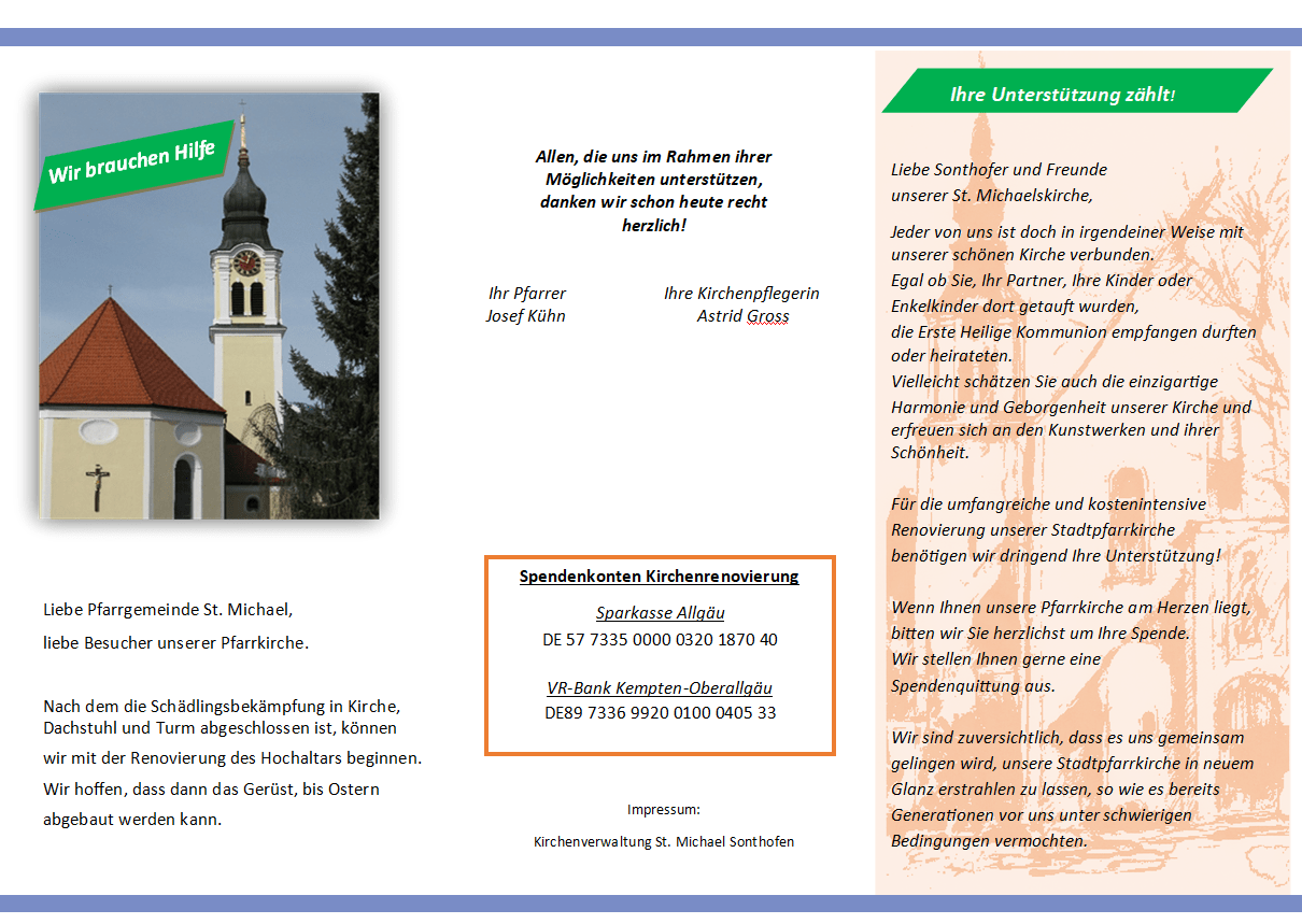 Nähere Termine finden sie im Kirchenanzeiger, auf der Veranstaltungsseite, sowie in den Schaukästen bei St. Michael.